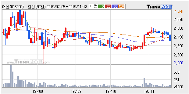 대현의 2018년 매출액은 2863억으로 전년대비 0.9% 상승했고, 영업이익 또한 179억으로 전년대비 29.0% 상승했다. 이 회사의 매출액 증감률과 영업이익 증감률은 각각 코스피 하위 40%, 상위 26%에 해당된다.