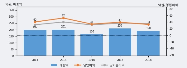 세명전기는 2018년 매출액 190억원과 영업이익 33억원을 기록했다. 전년대비 매출은 -8.9%, 영업이익은 -17.2% 각각 하락했다. 이 회사의 매출액 증감률과 영업이익 증감률은 각각 코스닥 하위 25%, 하위 44%에 해당된다.