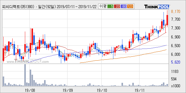 피씨디렉트의 2018년 매출액은 전년대비 5.6% 늘어난 2401억원이고, 영업이익 또한 전년대비 67.1% 늘어난 48억원을 기록했다. 이 회사의 매출액 증감률과 영업이익 증감률은 각각 코스닥 상위 48%, 상위 20%에 해당된다.