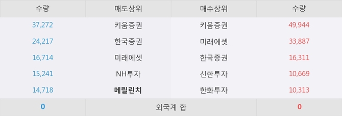 이 시각 주요 거래원은 미래에셋, 키움증권, 한국증권 등이 매수 상위 창구에 자리하고 있다. 한편, 매도 창구 상위에는 메릴린치가 눈에 띄고 있다.