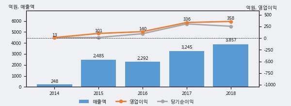 최근 실적을 살펴보면 2018년 매출액이 최근 5년 중 가장 높은 실적을 기록했음을 알 수 있다. 이전 최고 실적이었던 2017년 보다도 18.9%(612억 4천만원) 늘어난 것으로 나타났다.