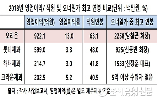 (조세금융신문=민경종 전문기자) 국내 제과시장 외형 2위 오리온(국내법인)이 지난해 제과 4사 중 가장 많은 영업이익과 최고의 수익성은 물론 직원과 오너 일가에게 최고 연봉을 지급한 것으로 나타나 업계의 부러움을 사고 있다.