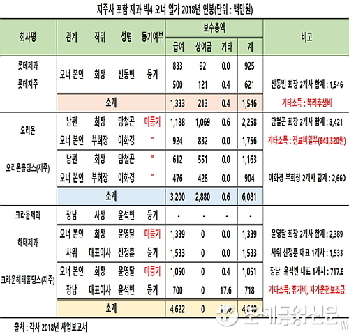 총자산 5조원 미만인 중견그룹 오리온의 회장이 국내 재계 5위권인 롯데그룹 총수이자 롯데제과 수장인 신동빈 회장보다도 더 많은 연봉을 지급한 것은 물론, 직원들 연봉 역시 해태제과, 크라운제과보다 약 1.5배 이상 더 많은 것으로 드러났기 때문이다.