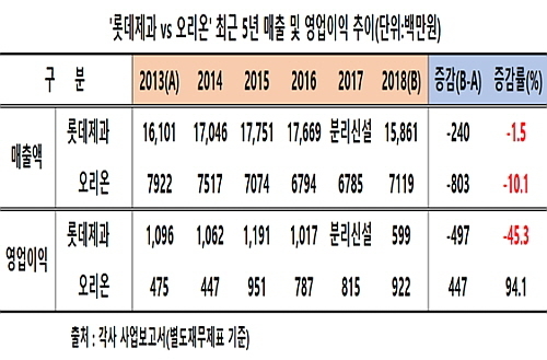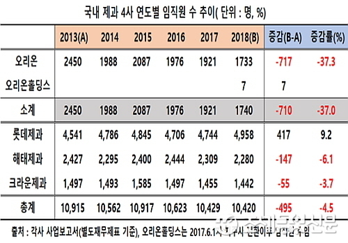 이런 악조건 속에서도 롯데제과는 현 정부의 일자리창출 정책에 적극 호응하며 직원 수를 오히려 더 늘린 반면에, 오리온(오리온홀딩스 포함)의 경우 직원 수는 2013년 2450명에서 지난해 1740명으로 무려 710명이나 줄어(감소율 37.0%) 대조를 보이고 있다.