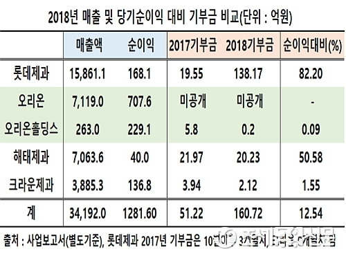 최대 경쟁사인 롯데제과는 별도기준 영업이익이 2016년 1017억 원에서 2018년 599억으로 41.1%나 급감했음에도 지난해 138.1억 원을 기부했고, 해태제과 역시 2016년 353.7억에서 지난해 214.7억으로 39.2% 줄었음에도 20.2억이나 기부한 것과 비교하면 무척 대조적이다.