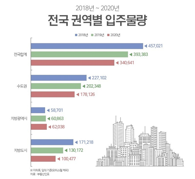 권일 부동산인포 리서치팀장은 “지방도시의 경우 경남과 경북 일대를 중심으로 한동안 분양시장이 위축되면서 분양이 줄어 입주물량 감소로 이어지고 있다”고 말했다.
