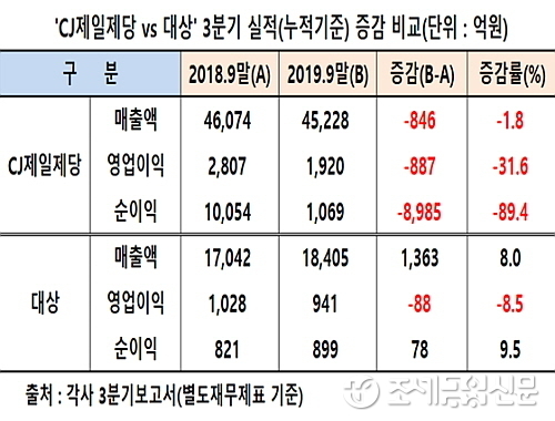 대상의 올 3분기 누적 영업이익은 941억으로 전년 동기 1028억 원보다 약 88억이 줄어 8.5% 감소한 반면, CJ제일제당은 1920억을 시현 전년도 2807억 대비 무려 31.6%나 급감했다.