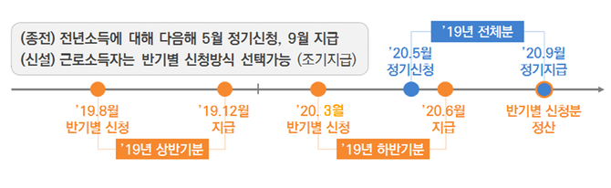 이전에는 직전연도 소득을 기준으로 5월에 신청해 9월에 1년치를 한꺼번에 지급했었지만, 소득발생시기와 돈 받는 시기 간 시차가 커서 체감을 떨어뜨린다는 의견이 많았었다.