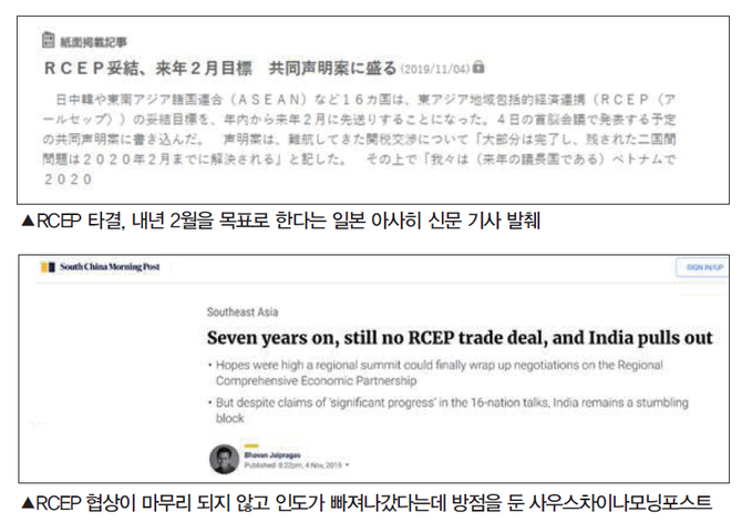 한편, 역대 최악으로 치닫고 있는 일본과의 관계 개선에 RCEP이 긍정적 역할이 될 수 있는지도 회의적이다. 기술한 바와 같이 우리는 한-중 FTA를 발효하여 경제블록체를 형성하고 있으나 사드체계에 따른 경제 보복에 전혀 힘을 쓰지 못했다.