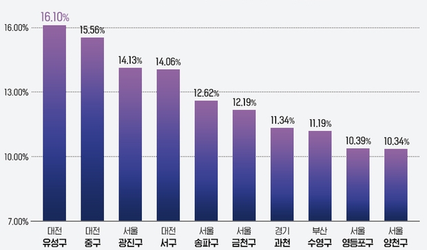 이 외에도 대전 서구가 14.06%, 서울 송파구 12.62%, 서울 금천구가 12.19%, 경기 과천 11.34%의 상승률을 보였고, 부산 수영구는 조정대상지역이 해제되면서 아파트 가격이 급등해 11.19% 상승률을 기록했다.