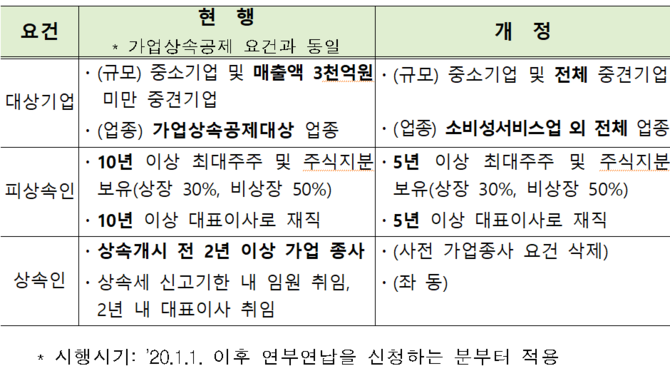 가업상속공제에 대해 제한적으로 허용하던 상속세 연부연납특례를 중소기업을 포함, 전체 중견기업까지 확대한다. 다만 소비성 서비스업은 제외된다.