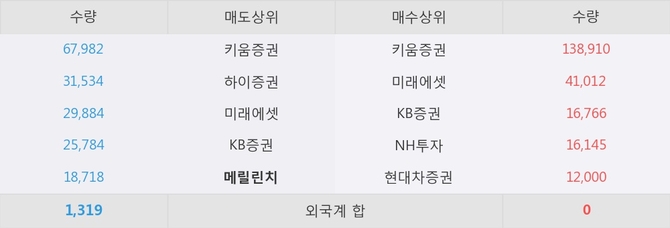 거래원 동향은 미래에셋, NH투자 등이 매수 상위 목록에 나타나고 있다. 한편, 매도 창구 상위에는 메릴린치가 눈에 띄고 있다.
