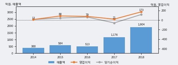 최근 실적을 살펴보면 2018년 매출액이 최근 5년 중 가장 높은 실적을 기록했음을 알 수 있다. 이전 최고 실적이었던 2017년 보다도 62.0%(728억 3천만원) 늘어난 것으로 나타났다.