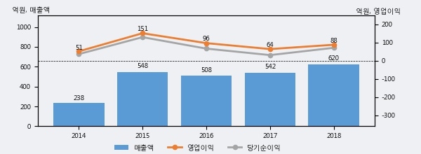 최근 실적을 살펴보면 2018년 매출액이 최근 5년 중 가장 높은 실적을 기록했음을 알 수 있다. 이전 최고 실적이었던 2015년 보다도 13.3%(72억 8천만원) 늘어난 것으로 나타났다.