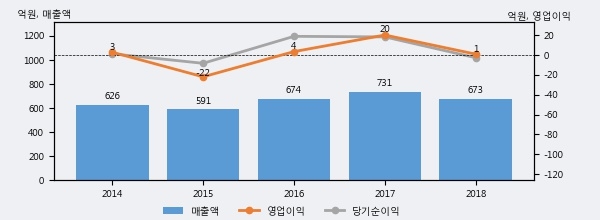 엔피케이의 2018년 매출액은 673억으로 전년대비 -8.0% 하락했고, 영업이익 역시 1억으로 전년대비 -95.5% 하락했다. 이 회사의 매출액 증감률과 영업이익 증감률은 각각 코스닥 하위 26%, 하위 19%에 해당된다.