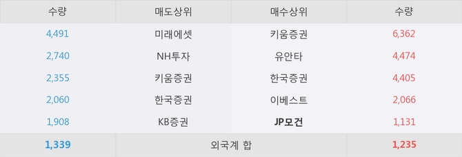 JP모건이 매수상위 창구 5위를 기록중이고, 그 외에 키움증권, 유안타 등이 매수 창구 상위에 위치하고 있다.