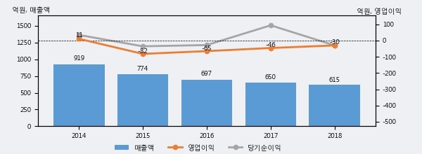 최근 3년간의 실적을 살펴보면, 매출액은 3년 연속 하락하고 있으나 그 하락폭은 줄어들고 있음을 알 수 있다.