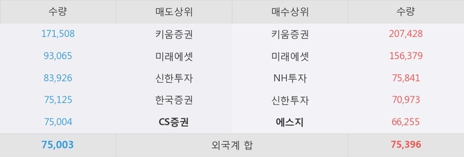 거래원 동향은 에스지, 미래에셋, NH투자 등이 매수 상위 목록에 나타나고 있다. 한편, 매도 창구 상위에는 CS증권이 눈에 띄고 있다.