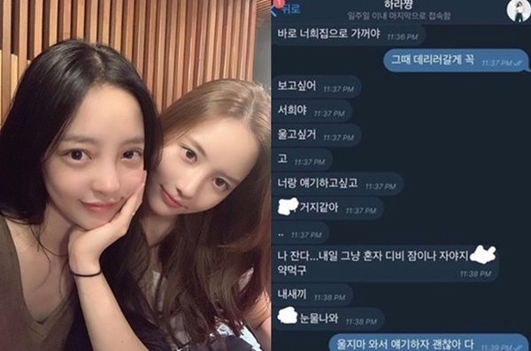 한서희가 공개한 대화 속에서 구하라는 "서희야 울고 싶고, 너랑 얘기하고 싶다. 내일 그냥 혼자 잠이나 자야겠다. 약 먹고"라며 슬픔을 참지 못하는 듯한 태도를 취했다.