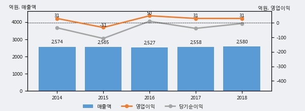 최근 실적을 살펴보면 2018년 매출액이 최근 5년 중 가장 높은 실적을 기록했음을 알 수 있다. 이전 최고 실적이었던 2014년 보다도 0.2%(6억 1천만원) 늘어난 것으로 나타났다.