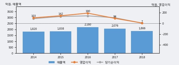 우주일렉트로의 2018년 매출액은 1866억으로 전년대비 -10.1% 하락했고, 영업이익 역시 7억으로 전년대비 -92.2% 하락했다. 이 회사의 매출액 증감률과 영업이익 증감률은 각각 코스닥 하위 23%, 하위 19%에 해당된다.