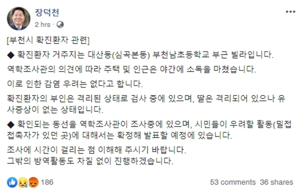한편, 1일 장덕천 부천시장은 자신의 페이스북에 "확진환자 거주지는 대산동(심곡본동) 부천남초등학교 부근 빌라입니다."라며 "역학조사관의 의견에 따라 주택 및 인근은 야간에 소독을 마쳤습니다"라고 전했다.