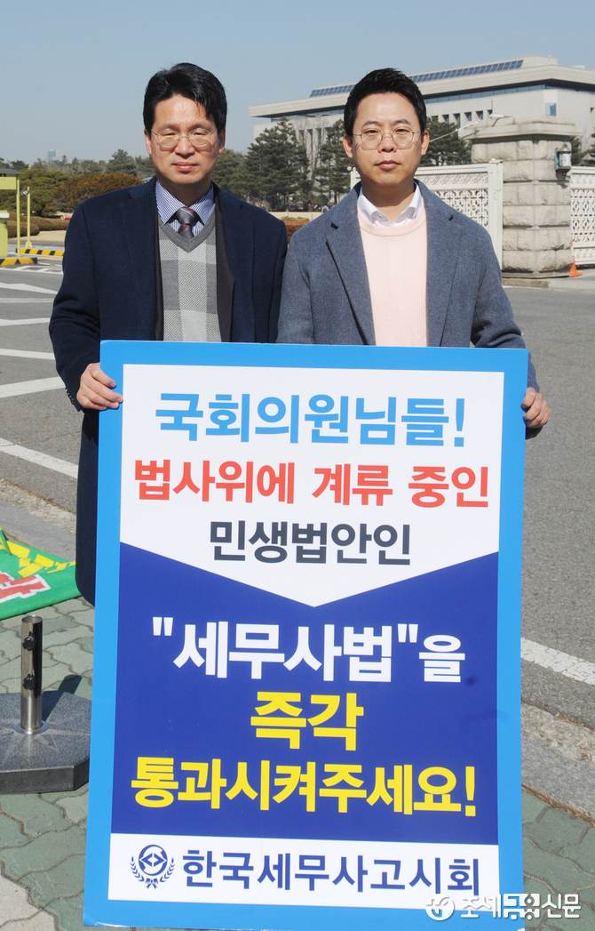 (조세금융신문=김용진 기자) 11일 오후 국회 정문 앞에서 이석정 한국세무사고시회 기획 부회장(왼쪽)과 김희철 한국세무사고시회 사업 부회장이 법사위에 계류중인 민생법안인 세무사법을 즉각 의결하라는 1인 시위를 하고있다.