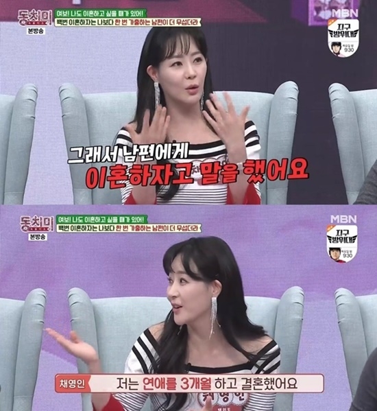 채영인은 16일 방송된 MBN '동치미'에서 이혼하고 싶었던 순간에 대해 이야기하던 중 "3개월 연애하고 결혼했다"며 "신혼 초 매일 전쟁처럼 싸웠다"고 말했다.