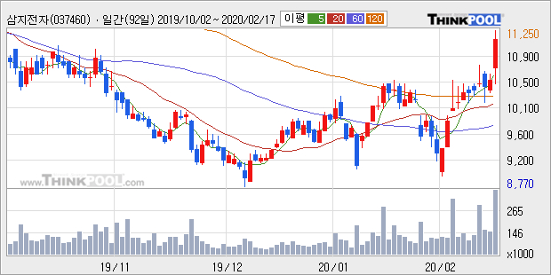 일봉 차트의 모습은 현재 단기·중기 이평선이 정배열 상태로 전형적인 상승세를 보이고 있다. 최근 이 종목의 차트에서 최근 60일 매물대 돌파 등의 특이사항이 발생했다.