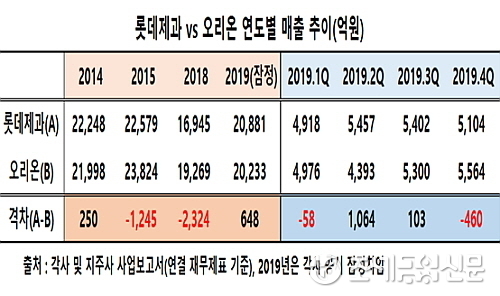 지난해 이들 회사의 매분기보고서 및 2019년 잠정 영업실적에 롯데제과는 국내외 종속법인의 실적을 반영한 연결재무제표 기준 총 2조881억 원의 누적매출을 시현, 2조233억 매출에 그친 오리온을 648억 원 가량 앞서며 업계 1위에 복귀하는 지각변동을 일으켰다.