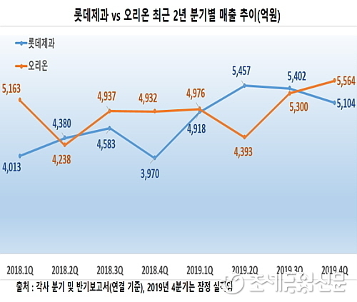 ■ 2019년 분기별 매출, 2, 3분기는 롯데, 오리온은 1,4분기 앞서..‘일진일퇴’ ..‘일진일퇴’