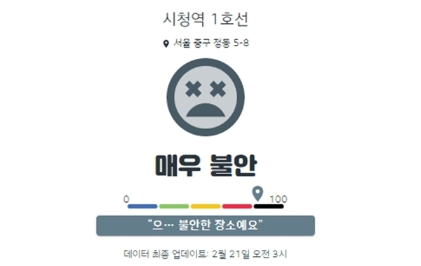 해당 사이트에 방문 장소를 검색하면 '매우 불안' '불안' '약간불안' '안심' '매우안심' 등으로 분류되며, 이는 코로나 확진자가 다녀간 위험도 순으로 나열된다.