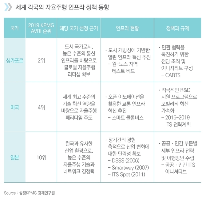 2019년 KPMG 자율주행 자동차 도입 준비 지수 보고서에 따르면, 싱가포르, 미국 등 글로벌 자율주행 선진국은 이미 민관 협력을 바탕으로 R&D 생태계를 구축하는 것으로 알려졌다.