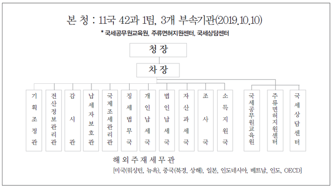 여기까지 오기에는 역대 국세청장들의 기업친화적인 세정을 운영함에 있어 분골쇄신 노심초사한 애증(愛憎)이 서려있어 가능했다고 다시금 새겨본다. 기획재정위원회에 보고된 2019년도 국세청 국정감사 자료에 따르면 ▲본청 조직이 11국 42과 1팀, 3개 부속기관(국세공무원교육원, 주류면허지원센터, 국세상담센터)등 ‘거대 국세청’으로 변신했다.