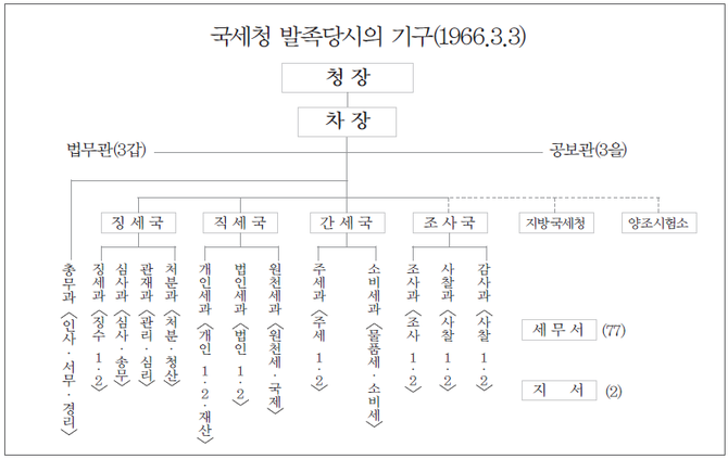 국세청 발족과 더불어 사세청을 지방국세청으로 개칭, 지금의 국세청→지방국세청→세무서와 같은 세무행정체제를 갖추게 됐다. 발족 당시의 국세청 기구조직의 특징을 보면, 조사국을 별도로 설치, 세무조사 기능을 강화한 점이다. 조세행정특별조사반의 조사 활동을 계승하여 탈세방지와 음성세원 포착을 통한 세수확보를 강력하게 추진하겠다는 정부의 의지가 반영된 조직임을 한눈에 알 수 있다.