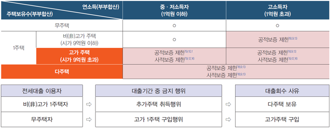 첫째, 고가주택 보유자에 대한 주택금융공사(HF), 주택도시보증공사(HUG) 및 서울보증보험(SGI)의 모든 보증부전세대출을 제한한다.