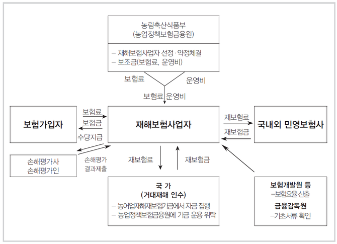 농작물재해보험에 가입한 재해보험가입자의 납입 순보험료의 50% 내외를 정부가 보조하며 지