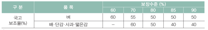자체는 10~40% 수준을 지원한다. 단, 아래 5개 품목(벼, 배, 단감, 사과, 떫은감)은 보장수준별로 40∼ 60% 차등 지원한다.