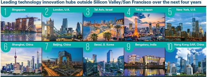 텔아비브는 지난해 15위에서 올해 3위로 올라섰다. 벵갈루루는 세계혁신지수(Global Innovation Index)의 인도 지수가 2015년 81에서 2019년 52로 개선되면서 지난해 18위에서 올해 9위를 기록했다.