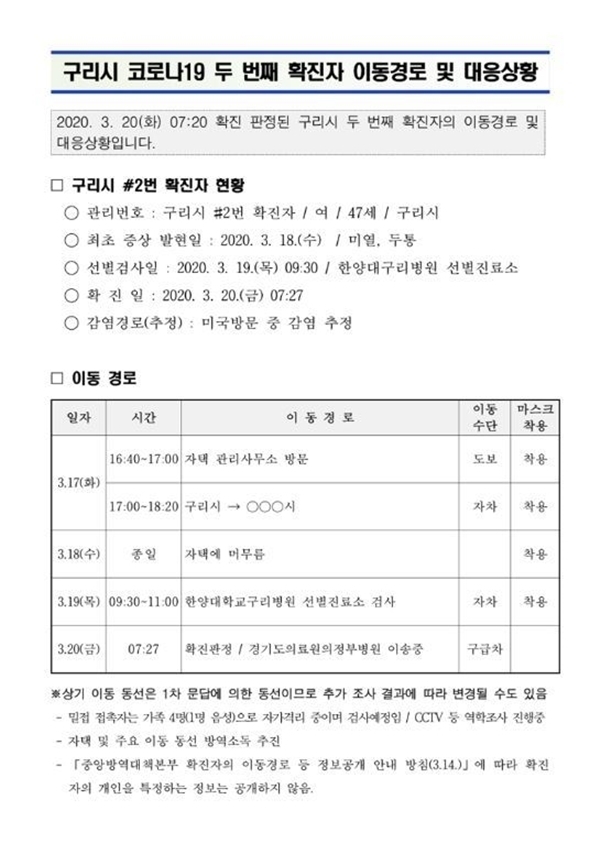 20일 구리시청은 긴급재난 문자를 통해 코로나19 확진자가 발생했음을 알렸다. 구리시청 홈페이지에는 두 번째 확진자의 이동경로가 공개됐다.