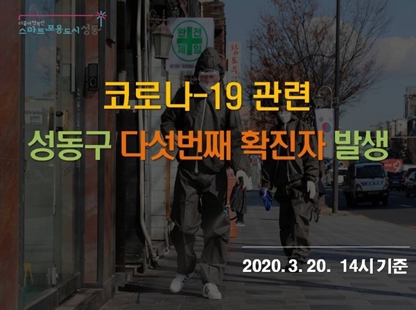 성동구청에 따르면, 성동구는 3월 20일 14시 기준 코로나19 확진자 5명, 의사환자 0명, 자가격리 29명, 유증상자 0명이다.