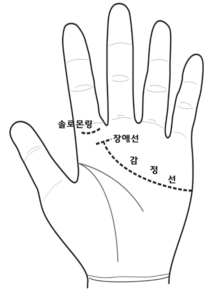 애정관계가 나쁘고 불안한데, 이때는 그동안 배워온 결혼선의 상태도 확인하면 좀 더 정확한 감정을 할 수 있을 것이다. 유의사항 한 가지는 솔로몬의링이라고 집게손가락 바로 아래있는 그림과 혼동하지 말 것. 솔로몬의 링은 추후 다시 언급할 곳이다.
