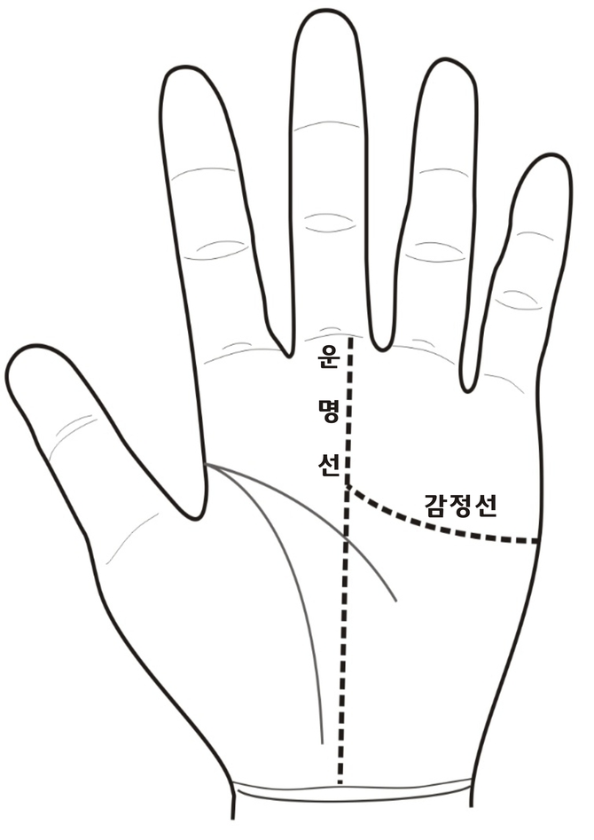 그림처럼 횡으로 그어진 운명선까지만 가로지른 감정선을 정상적이라고 한다. 참고로 복습하자면, 감정선과 운명선이 교차하는 지점이 나이 50세를 표시한다고 했었던 것 기억하고 있어야 한다. 감정선을 영어로 EQ(Emotional Quotient)를 나타내는 것이며 감성지수를 파악하는 선이라고 보면 된다.