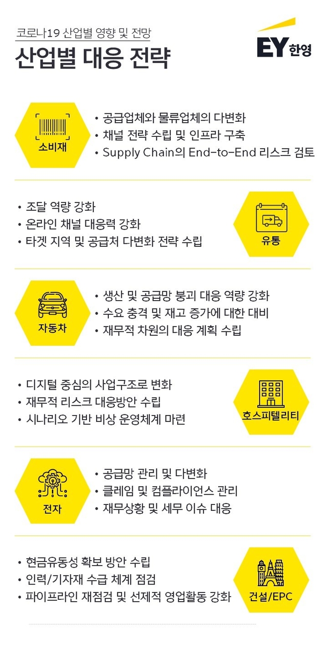 EY한영산업연구원은 소비재, 유통, 자동차, 호스피텔리티, 전자, 건설·엔지니어링 등 여섯개 산업군으로 나눠 코로나19에 대한 맞춤형 대응 전략을 소개했다.