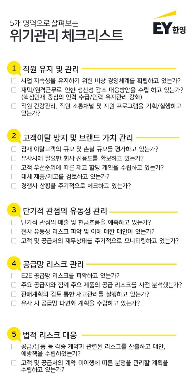 직원 유지 및 관리, 고객 이탈 방지 및 브랜드 가치 관리, 단기적 관점의 유동성 관리, 공급망 리스크 관리, 법적 리스크 대응 등에 대한 자가진단 리스트도 제공했다.