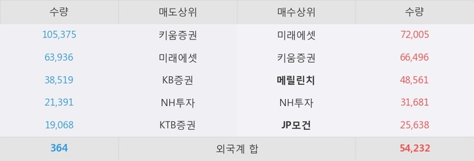 거래원 동향은 메릴린치, JP모건, 미래에셋 등이 매수 상위 목록에 위치하고 있다.