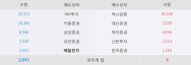 이 시각 주요 거래원은 하나금융, 대신증권, 하이증권 등이 매수 상위 창구에 자리하고 있다. 한편, 매도 창구 상위에는 메릴린치가 눈에 띄고 있다.