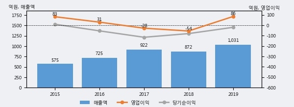 최근 실적을 살펴보면 2019년 매출액이 최근 5년 중 가장 높은 실적을 기록했음을 알 수 있다. 이전 최고 실적이었던 2017년 보다도 11.9%(109억 6천만원) 늘어난 것으로 나타났다.