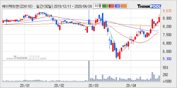 에이텍티앤은 2019년 매출액 1280억원과 영업이익 52억원을 기록했다. 전년대비 매출은 8.0% 상승했고, 영업이익은 -34.0% 하락했다. 이 회사의 매출액 증감률과 영업이익 증감률은 각각 코스닥 상위 45%, 하위 33%에 해당된다.