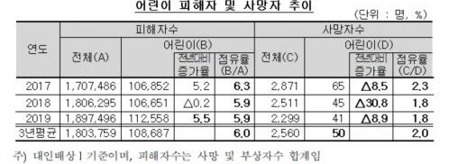 2018년(-0.2%) 감소에서 증가로 돌아선 것이다. 다만 전체 교통사고 피해자에서 어린이가 차지하는 비중은 5.9%로 전년과 같았다.